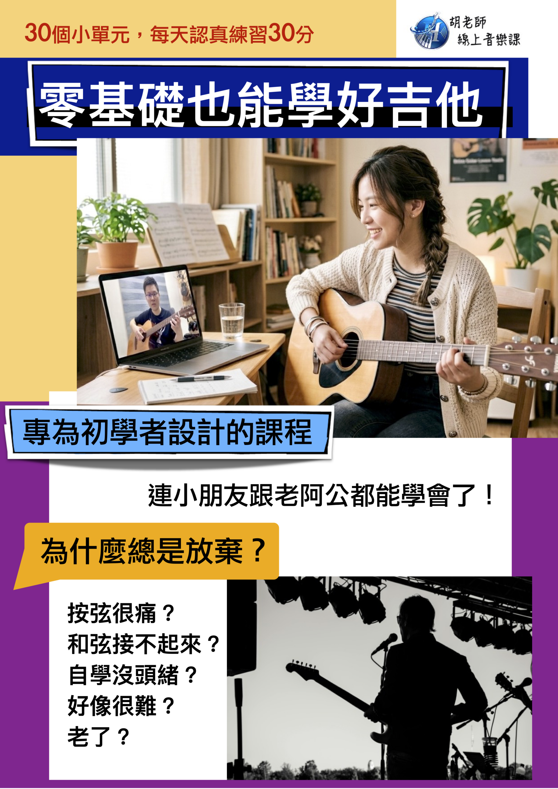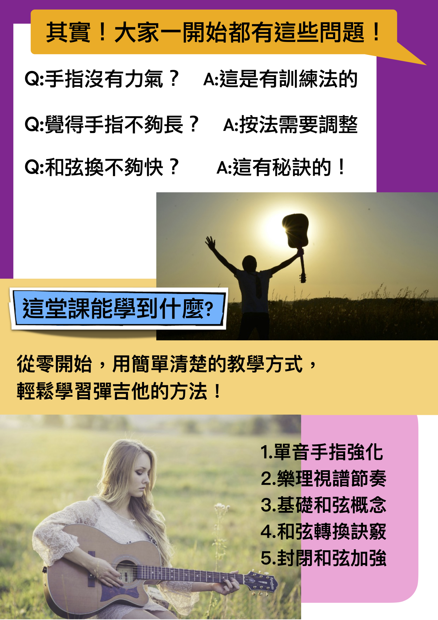 專為吉他初學者設計的線上課程,強調循序漸進,並用最能懂的方法教您彈好吉他!